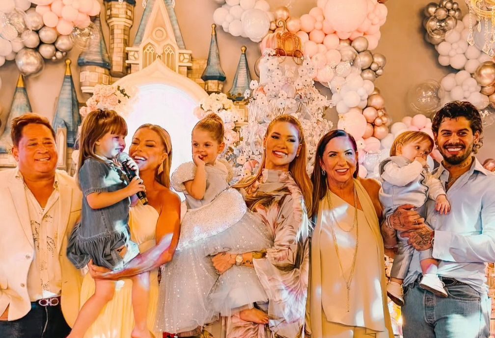 Vestindo uma camisa azul-clara, no tom da decoração, o cantor posou ao lado dos pais, da ex-sogra, Margareth Serrão, e de Virginia, junto com as filhas, para celebrar a festa da pequena.